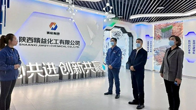 許緘濤一行首先來到陜西精益化工有限公司展覽室進行參觀,通過講解員的講解,就企業(yè)的發(fā)展歷程、一期建設50萬噸/年煤焦油深加工多聯(lián)產(chǎn)綜合利用項目及2×40.5MVA硅鐵礦熱爐綜合利用項目等進行了了解。