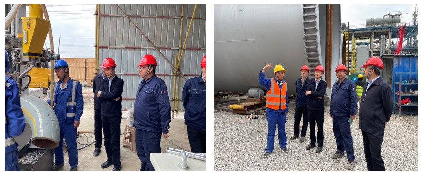 許緘濤還分別前往設備預制場、管道自動焊預制場,對最后一臺反應器的制造進程、組裝塔器“穿衣戴帽”進程、管道預制自動焊等工作進行調(diào)研。