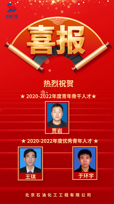 北京石油化工工程有限公司項(xiàng)目執(zhí)行中心副主任、專業(yè)副總工程師賈巖榮獲2020-2022年度青年骨干人才榮譽(yù)稱號(hào);電氣室于環(huán)宇、西安分公司油氣儲(chǔ)運(yùn)室王琪榮獲2020-2022年度優(yōu)秀青年人才榮譽(yù)稱號(hào)。